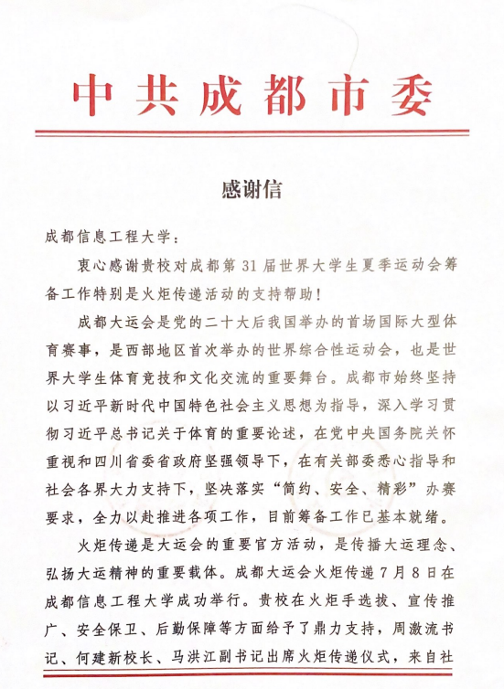 近日,成都best365中国官方网站收到中共成都市委、成都市人民政府成都大运会执委会发来的感谢信。感谢学校对成都第31届世界大学生夏季运动会