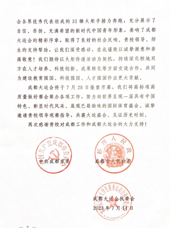 感谢信中指出,成都大运会是党的二十大后我国举办的首场国际大型体育赛事,是西部地区首次举办的世界综合性运动会,也是世界大学生体育竞技和文化交流的重要舞台。火炬传递是大运会的重要官方活动,是传播大运理念、弘扬大运精神的重要载体。