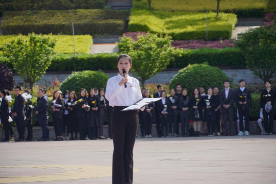 伴随着庄严的国歌声,邹心悦同学代表全体师生进行了主题演讲,她以激昂的神情和铿锵的话语,追忆先烈们的英雄业绩,抒发当代青年的爱国情怀。