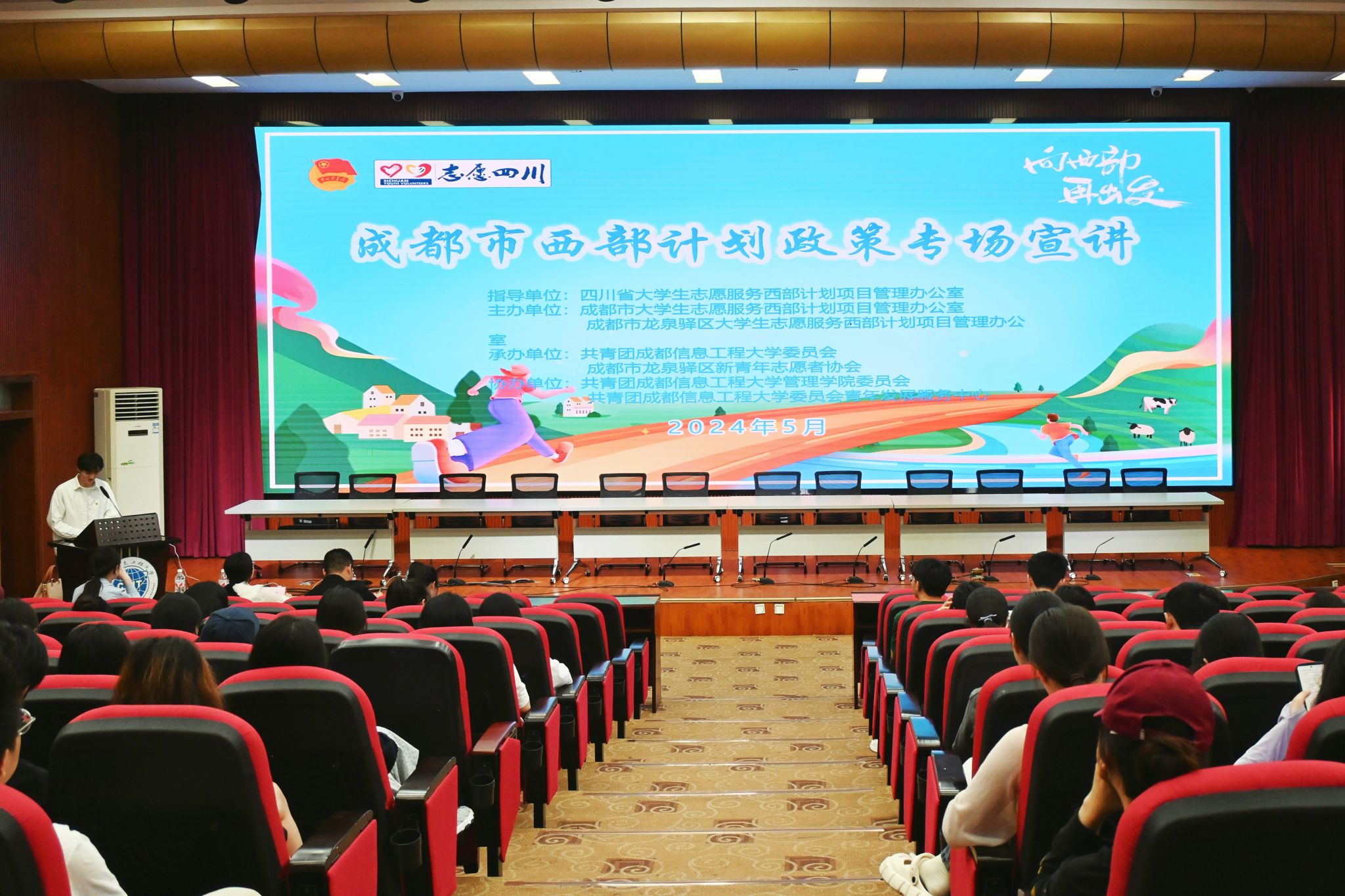 5月9日,校团委“青春就业大讲堂”——2024年“西部计划”政策专场宣讲活动在龙泉校区学术报告厅开展。活动邀请到共青团龙泉驿区委员会梁琼老师和两位投身“西部计划”的志愿者王钰龙、卿灵霖以及300余名师生到场参加了活动。
