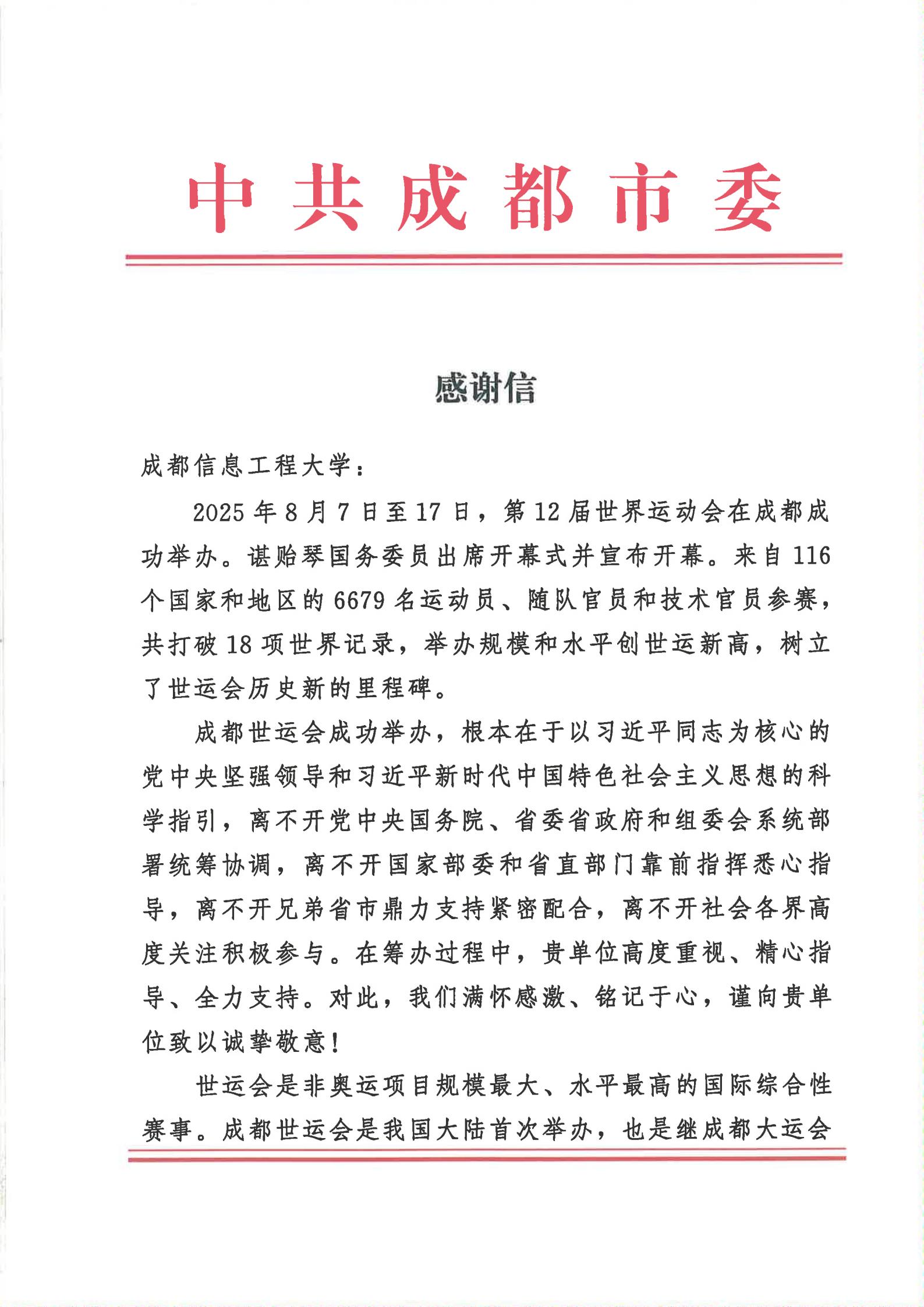 近日,学校收到中共成都市委、成都市人民政府、成都世运会执委会发来的感谢信。感谢学校在2025年第12届世界运动会筹办工作中作出的突出贡献,充分肯定了我校志愿者的专业素养和精神风貌。