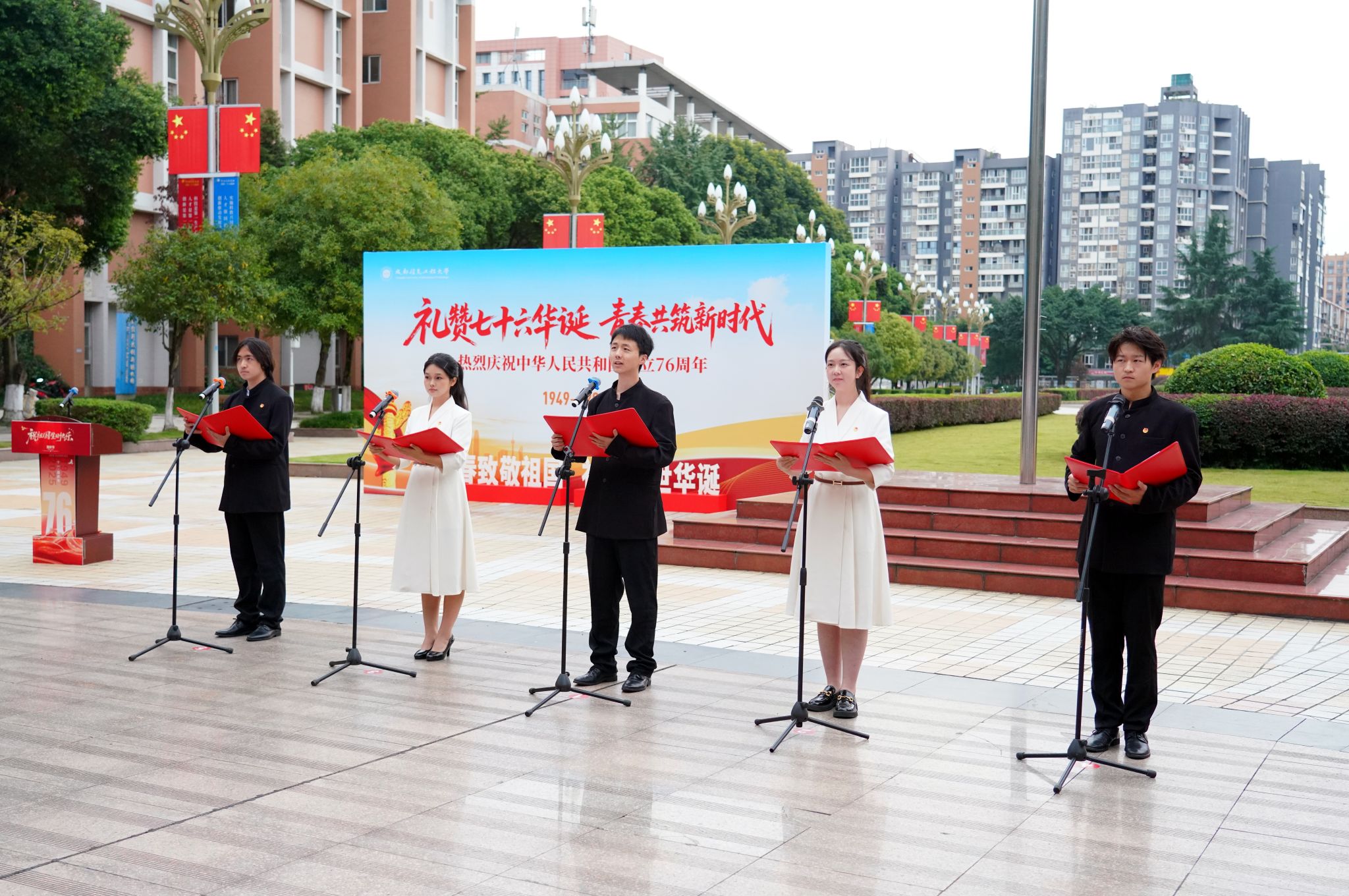 何建新、陈权亮分别在航空港、龙泉校区作国旗下讲话。何建新强调,76年前,新中国的成立犹如东方的一缕曙光,照亮了中华民族的历史长河。从艰苦卓绝的革命斗争,到波澜壮阔的改革开放,再到新时代中国特色社会主义的辉煌成就,伟大祖国走过了不平凡的历程。站在新时代的起点上,我们必须以更加饱满的热情、更加昂扬的斗志,投身到全面建成社会主义现代化强国的伟大事业中去。希望同学们要厚植家国情怀、树立远大理想、涵养高尚品德、强健心智体魄,在“向下扎根”的历练中积蓄“向上生长”的力量,成为民族复兴伟业的中坚力量;希望教师们时刻牢记为党育人、为国育才的初心使命,大力弘扬教育家精神,自信自强、踔厉奋发,为实现中华民族伟大复兴的中国梦而努力奋斗!