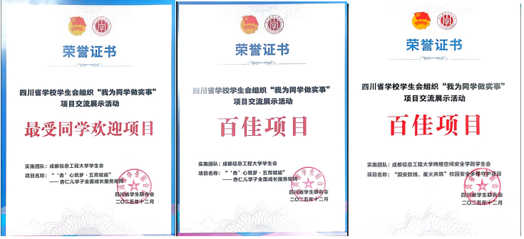 12月14日至15日,2025年四川省学校学生会组织“我为同学做实事”项目交流展示活动在成都举办。经过学校初选推荐、全省初选、同学满意度调查、现场答辩展示四个环节,我校推报项目在全省214所学校381个申报项目中脱颖而出。学校学生会“‘杏’心筑梦·五育赋能”——杏仁儿学子全面成长服务矩阵项目,经学生观察团和大众评审团综合评议,荣获四川省学生会服务同学“最受同学欢迎项目”(全省共30项)。该项目与网络空间安全学院学生会“国安防线,星火共筑”校园安全多维守护项目,也双双入选四川省学生会组织服务同学“百佳项目”(全省共100项)。三项荣誉的取得,集中彰显了我校服务育人的扎实成效。