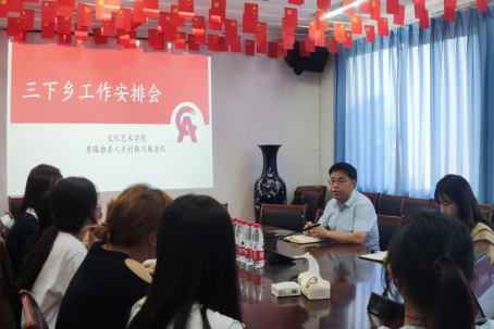 7月7日,文化艺术学院召开暑期三下乡社会实践活动工作安排会,学院党委书记闵卫东,院团委书记,参加三下乡活动的全体同学参加了会议。会上,闵卫东对团队成功入选表示祝贺,希望团队成员明确实践目的,注重理论联系实际,在服务乡村振兴的实践活动中增见识、长才干。他勉励同学们不怕吃苦,虚心学习,加强沟通,服从安排,确保安全。李雅婧围绕活动实施作了人员分工和日程安排,并强调了活动中的注意事项。